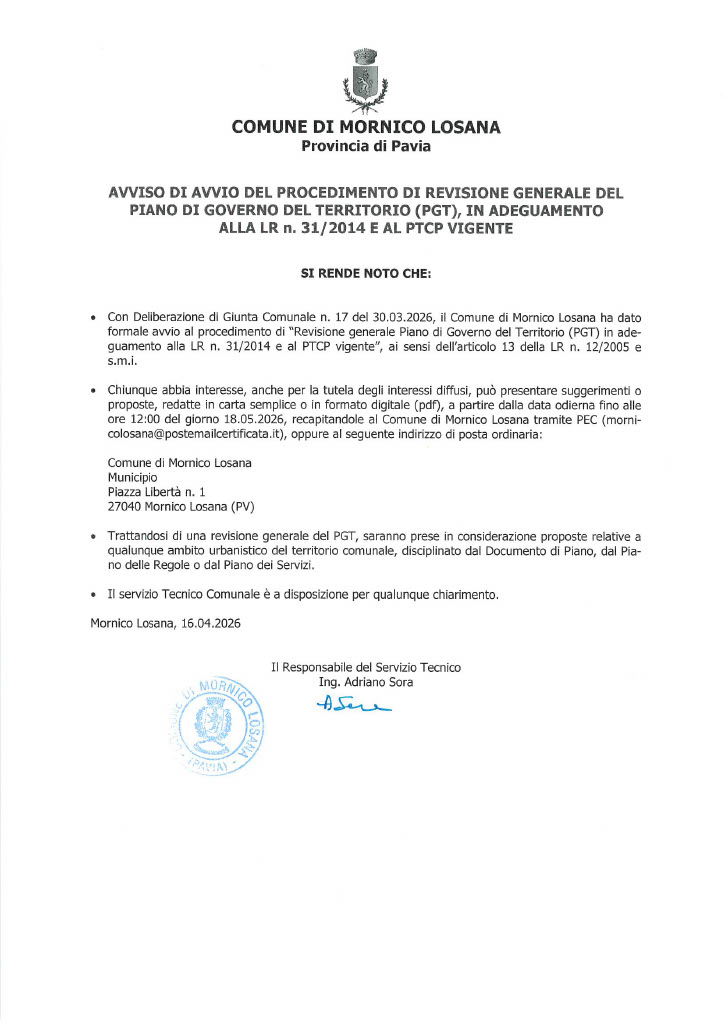 Descrizione vedasi avviso in allegato Allegati Documenti Avviso [.pdf 186,9 Kb - 16/04/2026] A cura di Ufficio Tecnico Ultimo aggiornamento pagina: 16/04/2026 12:40:42